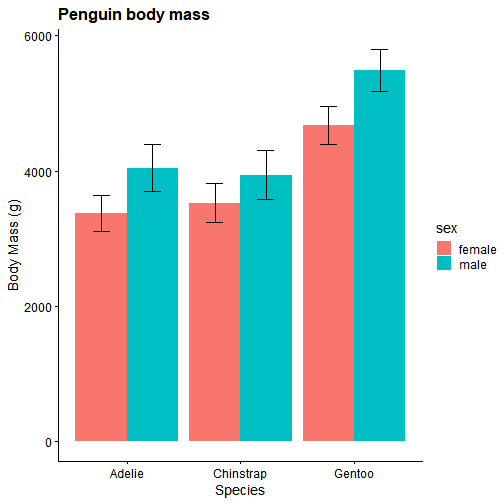 class: center, middle, inverse, title-slide # Plotting with ggplot2 in R ### Bishwarup Paul --- # What is GGPLOT? .pull-left[ GG stands for **"Grammar of Graphics"** Defines a step-by-step method for building a graph. ### Installation and usage: ``` install.packages("ggplot2") library(ggplot2) ``` ] .pull-right[ ### Based on:  ] --- # The grammar of graphics .pull-left[ ### Steps of building a graph with ggplot - Start by defining data, x and y variables, colour/fill etc. - Mention plot type - Mention statistics to be shown - Mention slide title, x and y axis titles - Mention theme *The first two points are mandatory for a plot, rest are optional.* *There are many more commands and options, will come to them later.* ] .pull-right[ ```r ggplot(data = data, aes(x = xvar, y = yvar, colour=group)) + geom_point() + geom_errorbar() + labs( title = "Main title", x = "X axis title", y = "Y axis title") + theme_default() ``` ] --- # The data we are going to work with Data on penguins at Palmer Station, Antarctica LTER. ```r library(palmerpenguins) data(package = "palmerpenguins") data(penguins) library(knitr) kable(head(penguins,5), format="html") ``` <table> <thead> <tr> <th style="text-align:left;"> species </th> <th style="text-align:left;"> island </th> <th style="text-align:right;"> bill_length_mm </th> <th style="text-align:right;"> bill_depth_mm </th> <th style="text-align:right;"> flipper_length_mm </th> <th style="text-align:right;"> body_mass_g </th> <th style="text-align:left;"> sex </th> <th style="text-align:right;"> year </th> </tr> </thead> <tbody> <tr> <td style="text-align:left;"> Adelie </td> <td style="text-align:left;"> Torgersen </td> <td style="text-align:right;"> 39.1 </td> <td style="text-align:right;"> 18.7 </td> <td style="text-align:right;"> 181 </td> <td style="text-align:right;"> 3750 </td> <td style="text-align:left;"> male </td> <td style="text-align:right;"> 2007 </td> </tr> <tr> <td style="text-align:left;"> Adelie </td> <td style="text-align:left;"> Torgersen </td> <td style="text-align:right;"> 39.5 </td> <td style="text-align:right;"> 17.4 </td> <td style="text-align:right;"> 186 </td> <td style="text-align:right;"> 3800 </td> <td style="text-align:left;"> female </td> <td style="text-align:right;"> 2007 </td> </tr> <tr> <td style="text-align:left;"> Adelie </td> <td style="text-align:left;"> Torgersen </td> <td style="text-align:right;"> 40.3 </td> <td style="text-align:right;"> 18.0 </td> <td style="text-align:right;"> 195 </td> <td style="text-align:right;"> 3250 </td> <td style="text-align:left;"> female </td> <td style="text-align:right;"> 2007 </td> </tr> <tr> <td style="text-align:left;"> Adelie </td> <td style="text-align:left;"> Torgersen </td> <td style="text-align:right;"> NA </td> <td style="text-align:right;"> NA </td> <td style="text-align:right;"> NA </td> <td style="text-align:right;"> NA </td> <td style="text-align:left;"> NA </td> <td style="text-align:right;"> 2007 </td> </tr> <tr> <td style="text-align:left;"> Adelie </td> <td style="text-align:left;"> Torgersen </td> <td style="text-align:right;"> 36.7 </td> <td style="text-align:right;"> 19.3 </td> <td style="text-align:right;"> 193 </td> <td style="text-align:right;"> 3450 </td> <td style="text-align:left;"> female </td> <td style="text-align:right;"> 2007 </td> </tr> </tbody> </table> --- # A simple example .pull-left[ ```r ggplot(data=penguins, aes(x=bill_length_mm, y=bill_depth_mm, colour=species))+ geom_point()+ labs( title = "Penguins at Palmer Station", x = "Bill length (mm)", y = "Bill depth (mm)") + theme_bw() ``` ] .pull-right[  ] --- # ggplot themes  --- # A better theme for publication The following theme comes from the package "cowplot" (Claus O. Wilke’s plot package) [(Link)](https://wilkelab.org/cowplot/index.html) .pull-left[ ```r library(ggplot) library(cowplot) ggplot(data=penguins, aes(x=bill_length_mm, y=bill_depth_mm, colour=species))+ geom_point()+ labs( title = "Penguins at Palmer Station", x = "Bill length (mm)", y = "Bill depth (mm)") + theme_cowplot() ``` ] .pull-right[ ] This theme comes with classic look for the plot, along with better text spacing, larger text and bold title. --- # Customizing plot - changing axis limits If you go back and look at the plot in the previous slide, the axis ticks are not complete. We can easily solve that by adding `expand_limits` command. .pull-left[ ```r plt + expand_limits(x = c(30,60), y=c(12,22)) ``` *The rest of the code is same as previous, so has been put inside ```plt```* ] .pull-right[  ] --- # Customizing plot - changing axis scaling In all the previous plots, the x and y axes were not in the same scale. If you require the axes to be in the same scale, that is easily doable. We just have to add `coord_equal()` command. ```r plt + expand_limits(x = c(30,60), y=c(12,22)) + coord_equal() ```  --- # Customizing plot - changing text style You can do many things using the `theme()` command, e.g. changing style, colour and angle of the texts. *Remember - this `theme()` command has to be used in addition to the `theme_cowplot()` (or other theme commands) that we are using.* .pull-left[ ```r plt + theme( axis.title.x = element_text(face="bold"), axis.title.y = element_text(face="bold"), axis.text.x = element_text(angle=45), axis.text.y = element_text(angle=45), plot.title = element_text(face="bold", color="blue"), legend.title = element_text(face="bold", color="red") ) ``` ] .pull-right[  ] --- # Plot types - Box and Whisker plot We have been using only scatterplots till now, using the command `geom_point()`. To make a box-and-whisker plot, or boxplot in short, use the command `geom_boxplot`. .pull-left[ ```r ggplot(data=penguins, aes(x=species, y=body_mass_g, fill=species))+ geom_boxplot()+ labs( title = "Box-and-Whisker plot", x = "Species", y = "Body mass (g)") + theme_cowplot() + theme(legend.position = "none") ``` ] .pull-right[  ] --- # Plot types - Box and Whisker plot with jittered points One plot style which is becomi